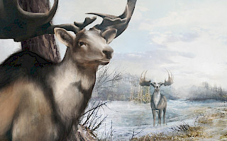 Im 360°-Panorama stehen Besucher*innen mitten in einer Herde von Riesenhirschen. Das immersive Gemälde zeigt die rekonstruierte urzeitliche Waldsteppe im Verlauf eines Jahres und erlaubt es den Betrachtenden, saisonale Ereignisse wie die Brunftzeit, Jungtiere oder Geweihwachstum visuell zu durchlaufen. Wissbegierige können direkt im Panorama entsprechende Interaktionspunkte anklicken, um relevante Zusatzinformationen abzurufen.